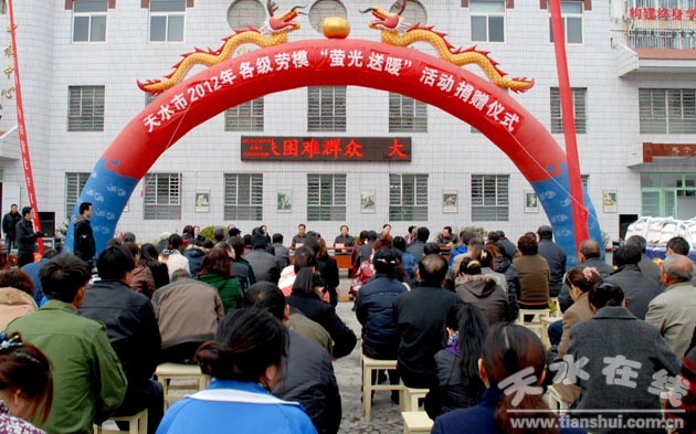 11月7日,寒冬來臨之際,由市總工會組織的2012年我市各級勞!拔灩馑团被顒郁咔刂輩^(qū)貧困家庭捐贈慰問儀式在天水市計算機(jī)專修學(xué)院舉行。市委常委、市委組織部部長王光慶,市人大常委會副主任、市總工會主席黃孝榮以及我市部分勞模代表,為秦州區(qū)170戶貧困家庭送上了慰問品和愛心卡,讓困難戶感受到了勞模的愛心的濃濃暖意。