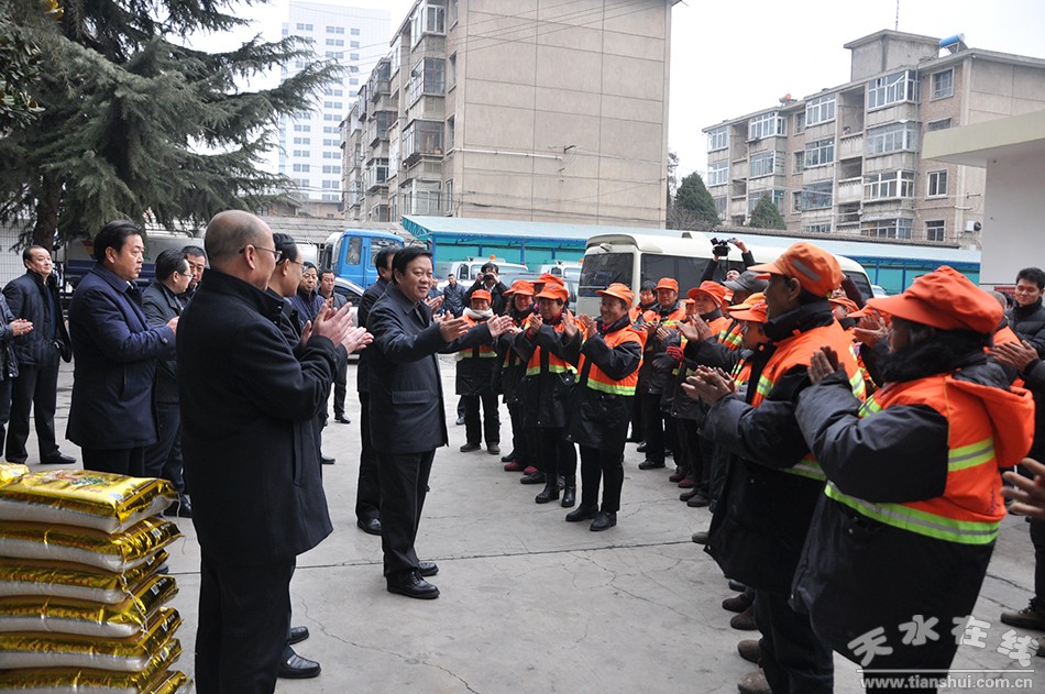 在秦州區(qū)環(huán)衛(wèi)處看望慰問環(huán)衛(wèi)工人時,楊維俊與一線環(huán)衛(wèi)工人們親切握手,代表市委、市政府和全市人民對“城市美容師們”表達了深深的敬意和誠摯的感謝,對環(huán)衛(wèi)工人辛勤勞動的成果和為城市建設所做出的貢獻給予了充分肯定。楊維俊說,我們城市的干凈整潔來自于每一位環(huán)衛(wèi)工人的辛勤付出。一年來,大家很辛苦、很勞累,我真誠地謝謝大家。希望廣大環(huán)衛(wèi)工人在新的一年里,繼續(xù)發(fā)揚愛崗敬業(yè)、無私奉獻的精神,努力提升我市的城市衛(wèi)生水平,為建設幸福美好新天水作出新的貢獻。