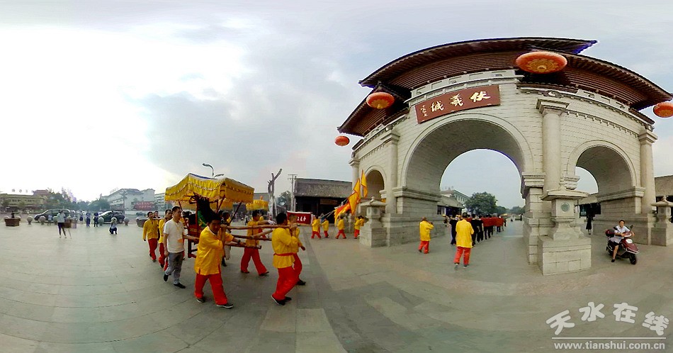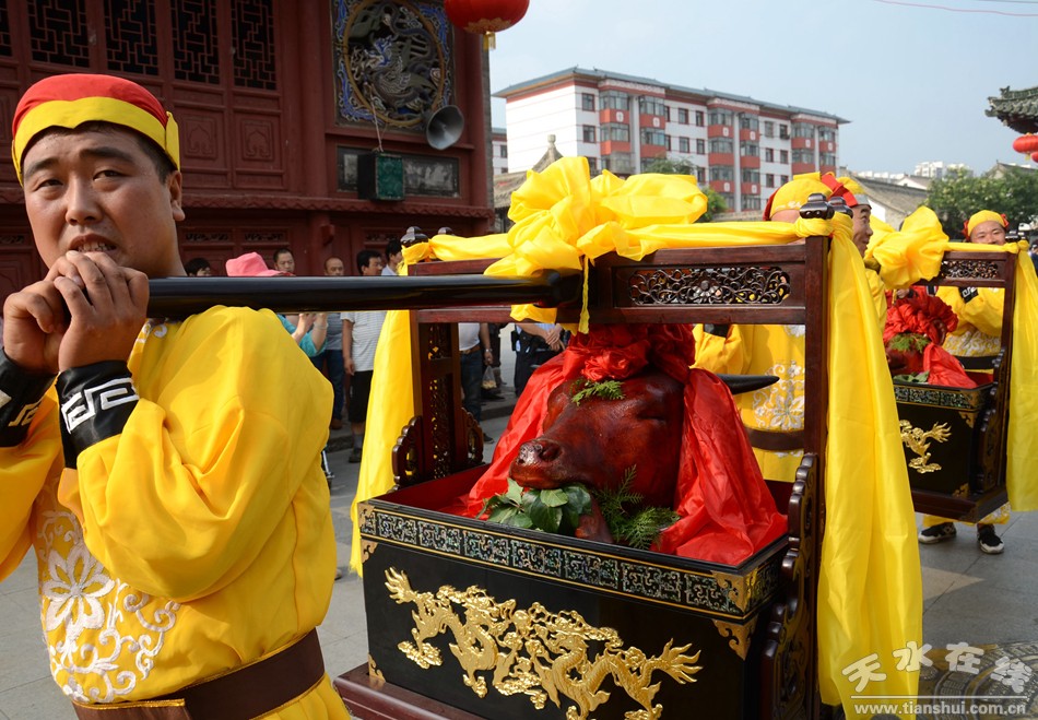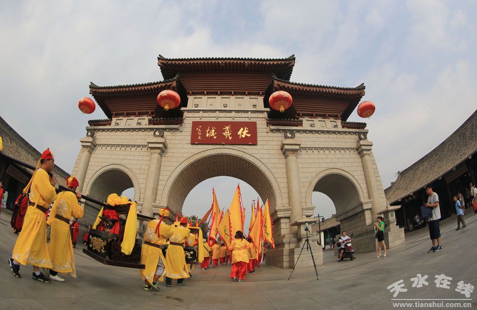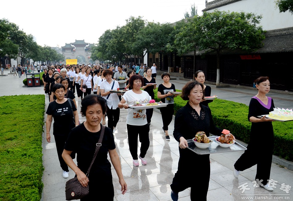 8月21日上午,天水伏羲廟舉行丙申(2016)年秋祭中華民族人文始祖太昊伏羲氏典禮之迎獻(xiàn)飯儀式。8時50分,儀仗隊、嗩吶隊從方神廟門前出發(fā),經(jīng)伏羲祭祀廣場西側(cè)通道至東側(cè)通道,“繼天立極”牌坊進(jìn)入伏羲廟太昊宮門前。