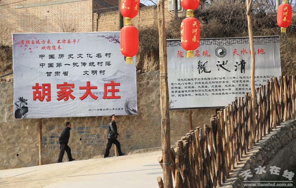 胡大村地處天水市麥積區(qū)新陽(yáng)鎮(zhèn)北部,南對(duì)鳳凰山山,渭水環(huán)繞,系新鳳、麥甘公路交匯處,全村有3個(gè)自然村768戶3675人。胡大莊村歷史悠久,文化底蘊(yùn)深厚,2012年被確定為全國(guó)第一批傳統(tǒng)村落,2014年被確定為全國(guó)第六批歷史文化名村。