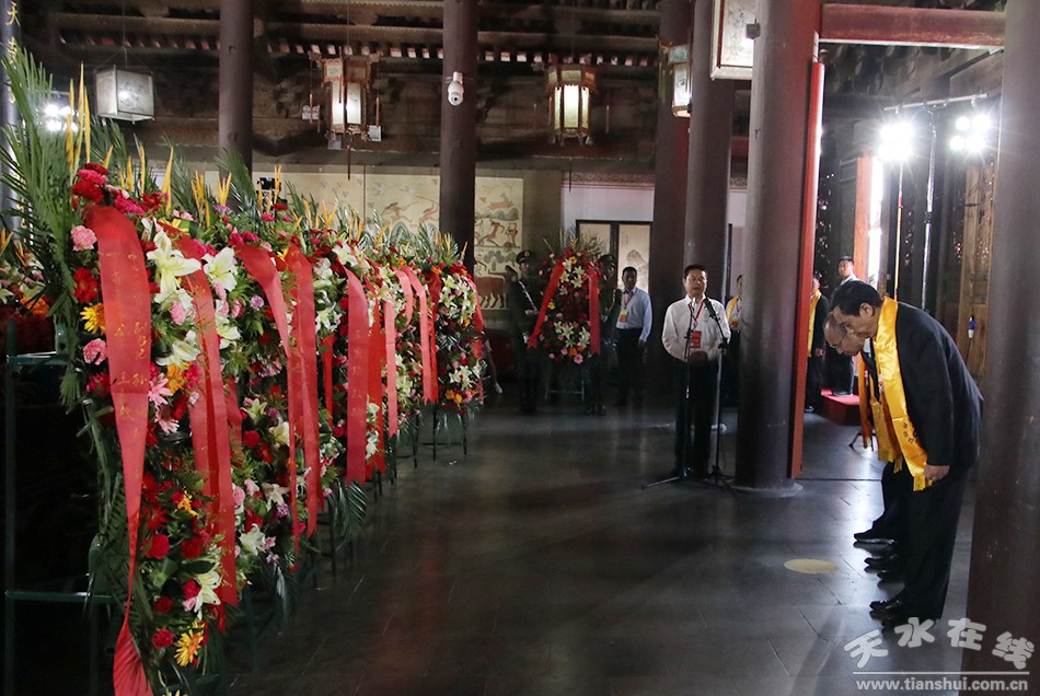 6月22日上午,2017(丁酉)年公祭伏羲大典在天水伏羲廟舉行。SOHO中國(guó)有限公司董事長(zhǎng)潘石屹,蘭州鐵路局局長(zhǎng)王峰,廣東邵偉華信息咨詢有限公司董事長(zhǎng)邵偉華,重慶市涪陵榨菜集團(tuán)股份有限公司銷(xiāo)售總監(jiān)王進(jìn)代表經(jīng)濟(jì)界,走進(jìn)伏羲廟,敬獻(xiàn)花籃、瞻仰伏羲圣像。