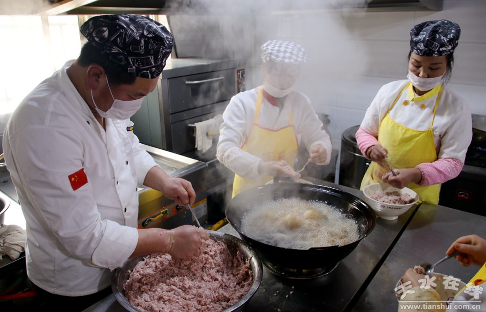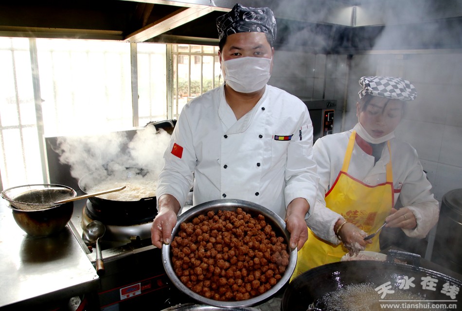 1月9日,臘月初四。天水廚藝人王婭萍的灶臺上,已經(jīng)備好了制作丸子的肉餡和調(diào)料,廚師們正在有條不紊的制作丸子。起鍋燒油,將肉餡一攪一捏一擠再拿小勺一挖一入油鍋,粉嫩嫩的肉丸子在油鍋中一翻滾就變得金黃……