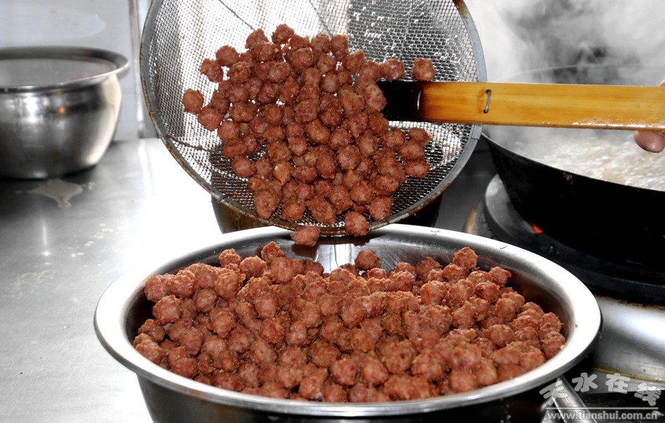 丸子是一種油炸食品,炸丸子要先將肥瘦相間的豬肉剁成豬肉末(王婭萍家的豬肉是來自臨洮縣狄道黑的高端黑豬肉,肥而不膩,健康營養(yǎng)。),打入雞蛋,再按比例加入調(diào)味品,攪拌均勻。鍋放油燒六成熱,將肉餡擠成個頭均勻的小丸子,入鍋炸至金黃色撈出,用勺將丸子拍松,再入鍋復炸,至焦脆撈出裝盤。做丸子時要多放幾個雞蛋加上些淀粉,這樣才可以把丸子“粘”緊一點,才不會散,做出的丸子才會“團團圓圓”,像一家人一樣要團得更緊“粘”得更牢。