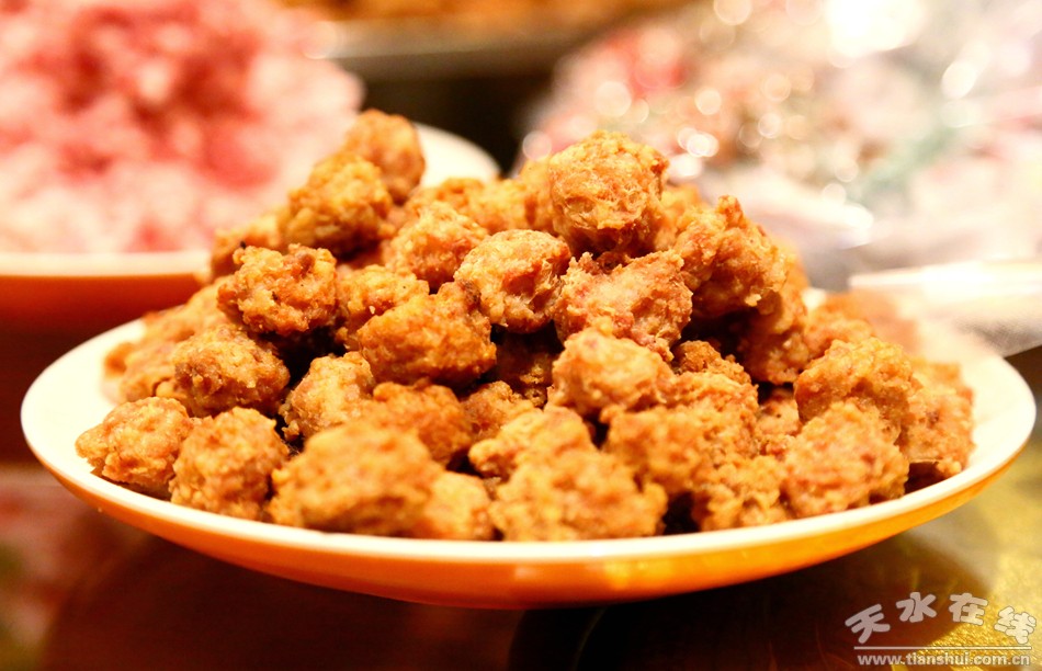 在天水,每逢佳節(jié)喜事,朋友聚會,一般都要做上幾樣扣碗子,而丸子則是扣碗子中不可或缺的一份子。每年臘月中旬,王婭萍家的扣碗子,就會迎來預定高峰。在這之前,王婭萍要做的就是先炸夠足量的丸子。